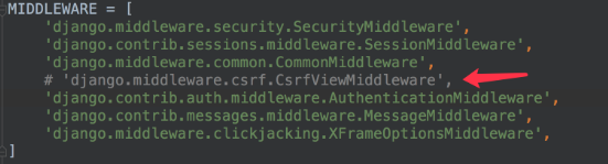 Django默认开启了CSRF防护,会对上述请求方式进行CSRF防护验证,在测试时可以关闭CSRF防护机制,方法为在settings.py文件中注释掉CSRF中间件,如: