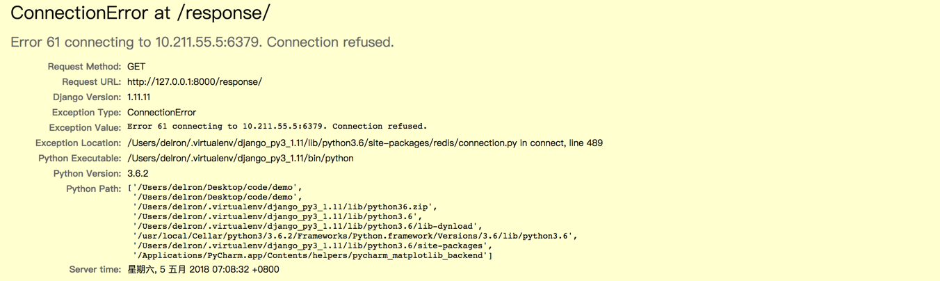 如果redis的ip地址不是本地回环127.0.0.1,而是其他地址,访问Django时,可能出现Redis连接错误,如下: