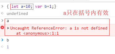 上面代码在代码块之中,分别用let和var声明了两个变量。然后在代码块之外调用这两个变量,结果let声明的变量报错,var声明的变量返回了正确的值。这表明,let声明的变量只在它所在的代码块有效。